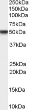Western Blot Approx 50kDa band observed in lysates of cell lines HepG2 and HeLa (calculated MW of 35.0kDa according to NP_006278.1). In transfected HEK293 transiently expressing TFPI bands of approx. 38kDa to 45kDa are observed. These bands are not obse