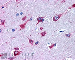 Immunohistochemistry In paraffin embedded Human Cortex shows pixulate cytoplasm staining in some neuronal cells. Recommended concentration, 3-5µg/ml.