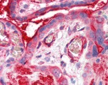 Immunohistochemistry In paraffin embedded Human Placenta shows trong staining of cytoplasm in syncytiotrophoblasts.. Recommended concentration, 5-10µg/ml.