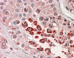 Immunohistochemistry In paraffin embedded Human testis shows polar cytoplasm staining in primary spermatocytes. Recommended concentration, 3-6µg/ml.