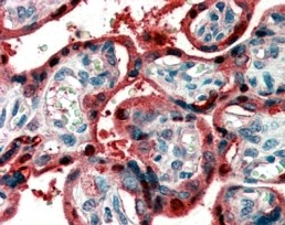 Immunohistochemistry In paraffin embedded Human Placenta shows staining of trophoblast cytoplasm. Recommended concentration, 2-5µg/ml.