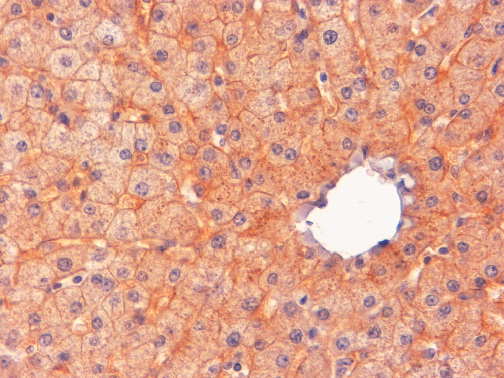 Immunohistochemistry In paraffin embedded Human Liver shows membranous staining in many hepatocytes. Recommended concentration