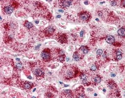 Immunohistochemistry In paraffin embedded Human Liver shows vesicular staining in the cytoplasm of hepatocytes. Recommended concentration
