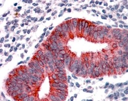 Immunohistochemistry In paraffin embedded Human Uterus shows vesicular and membranous staining in the endometrial glands. Recommended concentration, 4-8µg/ml.