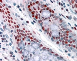 Immunohistochemistry In paraffin embedded Human Colon shows nuclear staining in absorptive cells. Recommended concentration, 3-6µg/ml.