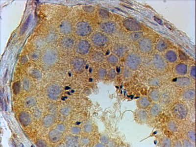 Immunohistochemistry In paraffin embedded Human Testis shows textured cytoplasm staining in all germ cells. Recommended concentration, 4-6µg/ml.