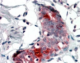 Immunohistochemistry In paraffin embedded Human Breast shows staining of cytoplasm in some acinar cells.. Recommended concentration, 4-6µg/ml.