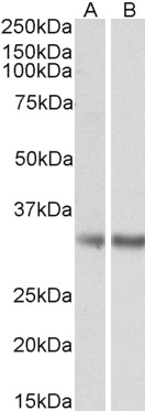 Western Blot Approx 35kDa band observed in Human Brain (Frontal Cortex) and Mouse Adipose lysates (calculated MW of 33.3kDa according to NP_001003794.1). Recommended concentration