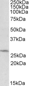 Western Blot Approx 28kDa band observed in HepG2 lysates (calculated MW of 30.1kDa according to NP_065691.2). Recommended concentration