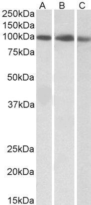 Western Blot Approx 100kDa band observed in lysates of cell lines K562, Molt4 and NIH3T3 (calculated MW of 90.6kDa according to NP_003143.2). Recommended concentration