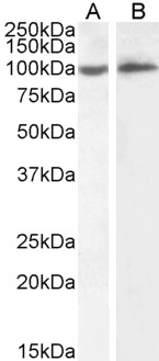 | Western Blot | Approx 100kDa band observed in lysates of cell lines Daudi, HeLa and NIH3T3 (calculated MW of 57.8kDa according to Human NP_000192.2 and 58.8kDa according to Mouse NP_034623.1). The observed molecular weight corresponds to earlier findings |