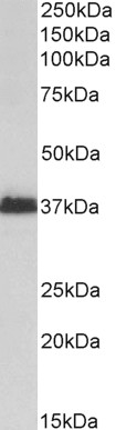 Western Blot Approx 37kDa band observed in lysates of cell line Kelly (calculated MW of 35.2kDa according to NP_620412.1). Approx 35+37kDa bands observed in fetal Mouse Brain lysates (calculated MW of 36.9kDa according to NP_473384.1 ). Recommended conc
