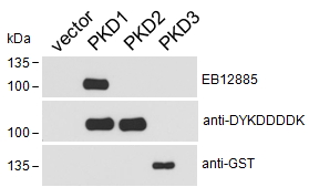 Western Blot In transfected HEK293 transiently expressing Human PKD1 (DYKDDDDK tagged), a band of approx. 100kDa is observed. The same band is observed using anti- DYKDDDDK antibody and no bands are observed in cells transiently expressing Human PKD2 or