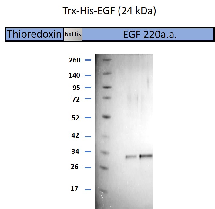 Description Epidermal Growth Factor Human Recombinant produced in E.Coli is a single, non-glycosylated, polypeptide chain containing 53 amino acids, fused with His Tag and Thioredoxin at N-Terminal, having a combined molecular mass of 24kDa. EGF is purified by proprietary chromatographic techniques.