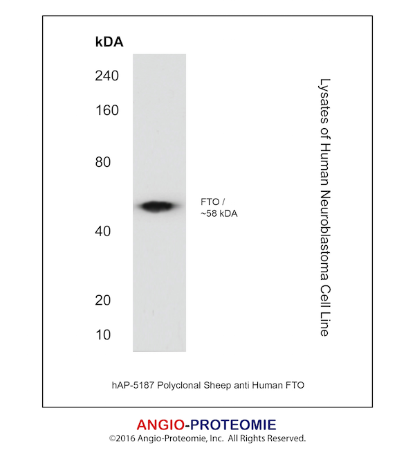 Preparation This antibody was produced from a sheep immunized with purified human FTO protein.