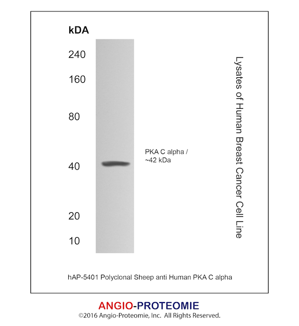 Specificity Detects human PKA C alpha in Western blots. In Western blots, less than 1% cross-reactivity with recombinant human (rh) PKA C beta or rhPKA C delta is observed.