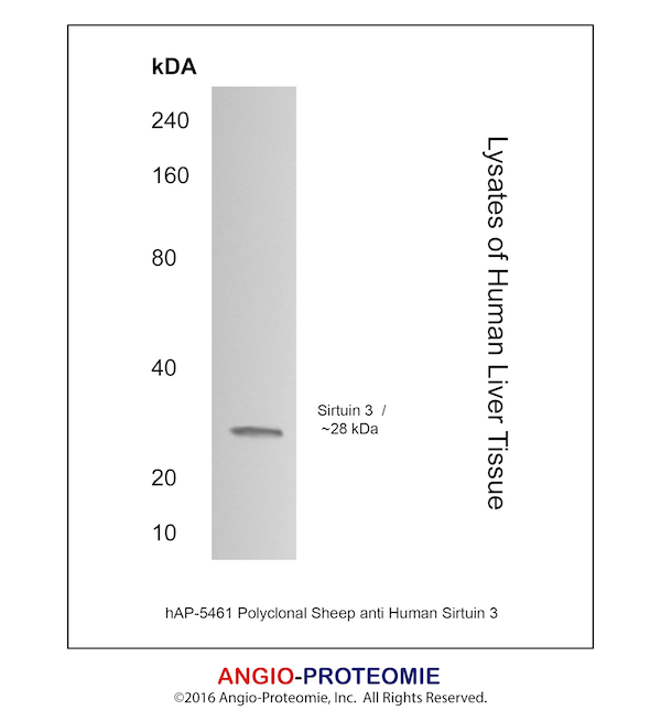 Preparation This antibody was produced from a sheep immunized with purified human Sirtuin 3 protein.