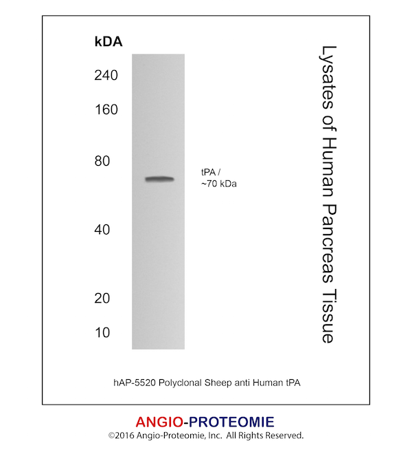 Preparation This antibody was produced from a sheep immunized with purified human t-Plasminogen Activator/tPA protein.