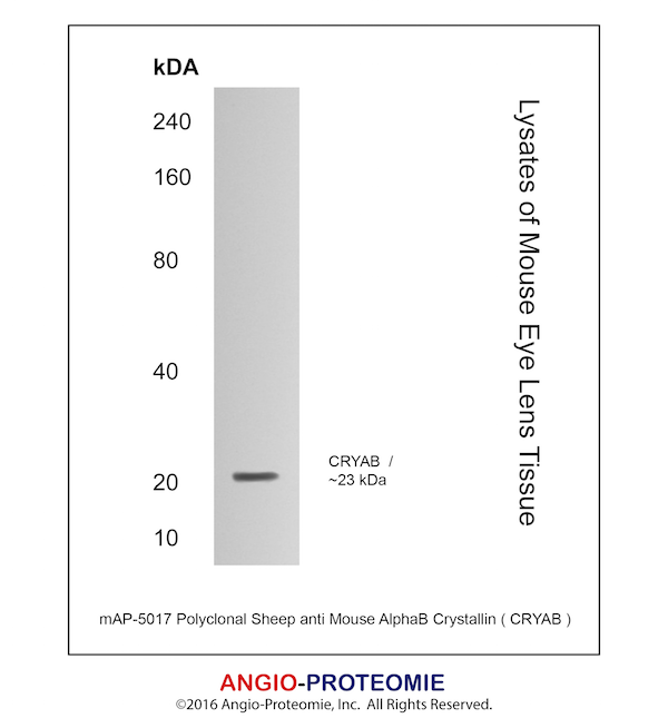 Preparation This antibody was produced from a sheep immunized with purified mouse AlphaB Crystallin/CRYAB protein.