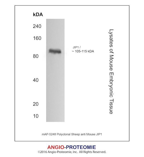 Preparation This antibody was produced from a sheep immunized with purified mouse JIP1 protein.