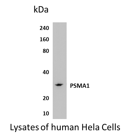 Preparation This antibody was produced from a hybridoma (mouse myeloma fused with spleen cells) from a mouse immunized with Recombinant human PSMA1 (Proteosome subunit alpha type-1). PSMA1 is also called 30kDa prosomal protein/PROS30, HC2, proteasome component C2/PSC2, PSMA-1/alpha6, and NU and is a 30kDa member of the peptidase T1A family of enzymes