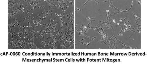 | HBMMSCs (cAP-0050) are isolated from human Bone Marrow tissues and demonstrated with spindle-shaped-, and fibroblast-like cells. CI-HBMMSCs (cAP-0060) are selected from Puromycin resistant HBMMSCs after infected with lentiviruses expressing SV40 LT under the control of TetON system. CI-HBMMSCs are maintained with proliferative capacity in the presence of Doxycycline (2ug/ml) in Mesenchymal Stem Cell Growth Medium (MSCGM, cAP-35). |