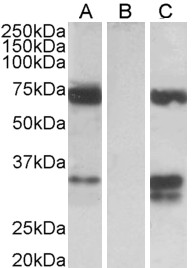 | Western Blot | HEK293 lysate (10ug protein in RIPA buffer) over expressing Human FOXC2 with DYKDDDDK tag probed with EB06007 (1.0ug/ml) in Lane A and probed with anti- DYKDDDDK Tag (1/1000) in lane C. Mock-transfected HEK293 probed with EB06007 (1mg/ml) i |