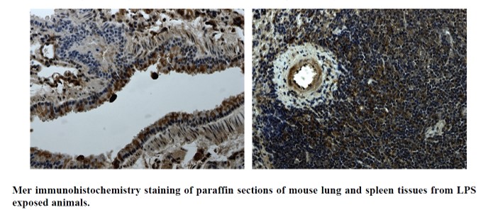 Specificity This antibody recognizes mouse Mer in western blot. It has no crossreactivity with rmAxl or rmDtk. cross-reactivity to Mer of other species has not been tested!