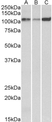 Western Blot Approx 110kDa band observed in Human, Mouse and Rat Heart lysates (calculated MW of 110kDa according to NP_001672.1). Recommended concentration