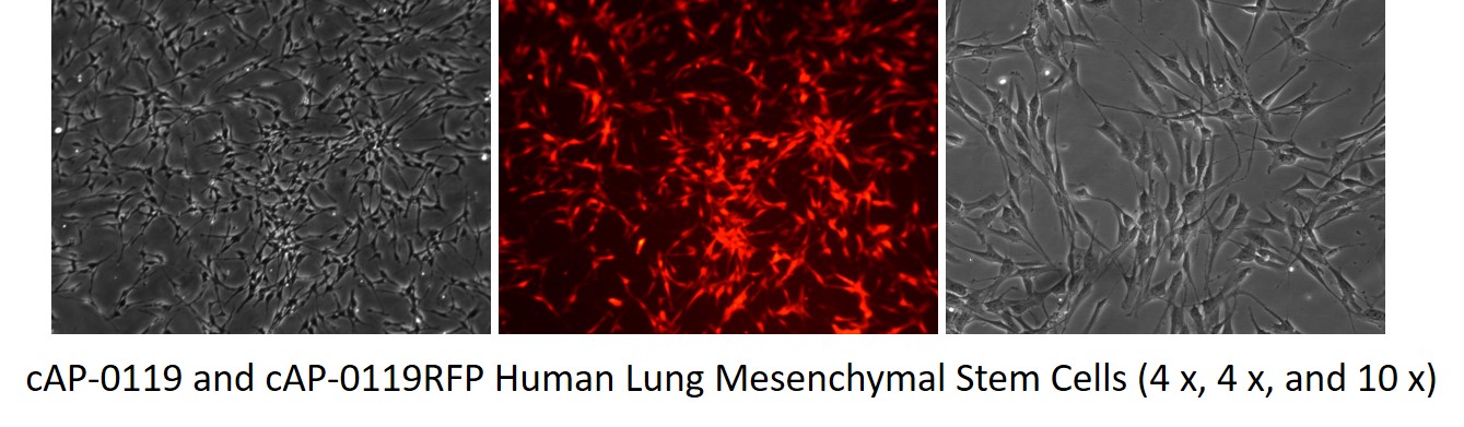 | HLu-MSCs (cAP-0119) are isolated from human lung tissue and demonstrated with spindle-shaped-, and fibroblast-like cells. RFP-HLuMSCs were selected from RFP-lentiviral infected cAP-0119 by Zeocin. Each lot of cAP-0119RFP cells are tested to ensure the cells can be passaged at least 10 times (i.e., approximately 10 to 15 population doublings) when cultured in complete growth media (Mesenchymal Stem Cell Growth Medium (MSCGM), cAP-35) following the detailed protocol described below). |