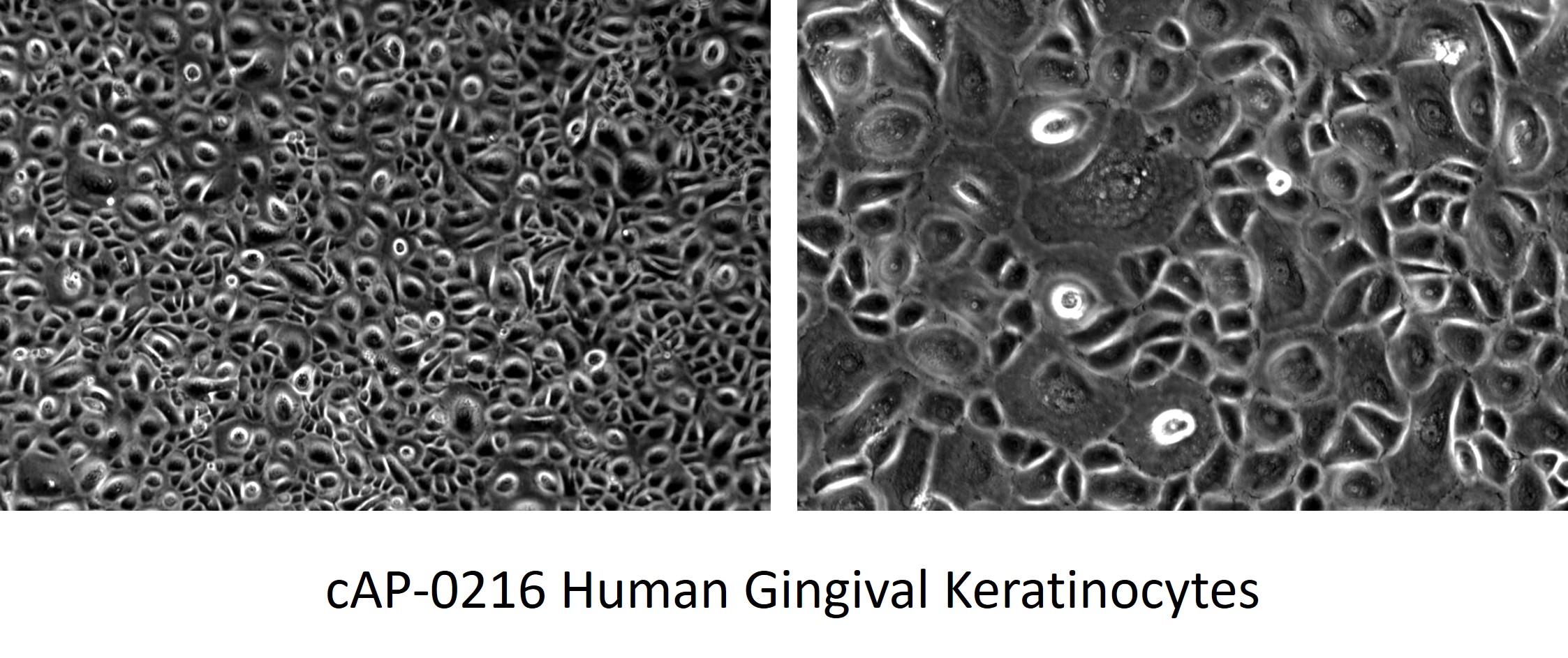 | Human Gingival Keratinocytes (cAP-0212) are isolated from normal human adult Gingival tissue. The cells are shipped in frozen vials (the cells are provided @ passage 2). Human Keratinocyte Growth Medium (KGM, cAP-67) is recommended for cell culture and these cells have a minimum average population doubling levels > 10 when cultured following the detailed protocol described below). Human Gingival Keratinocytes are negative for HIV-1, HBV, HCV, and mycoplasma |