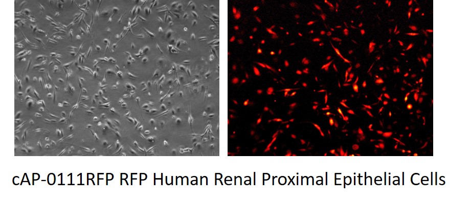 | Human Renal Proximal Tubule Epithelial Cells (HRPTEPs, cAP-0111) are initiated by digestion of minced human kidney cortex from a healthy donor. RFP-HRPTEPs are selected by puromycin after the HRPTEPs were infected with RFP-expressing lentiviruses under the control of the CMV promoter. Epithelial Growth Medium (EpGM) formulation-B (cAP-45C) containing FBS and growth supplement) is recommended for cell culture and these cells have a minimum average population doubling capacity > 8 when cultured following the detailed protocol described below). |