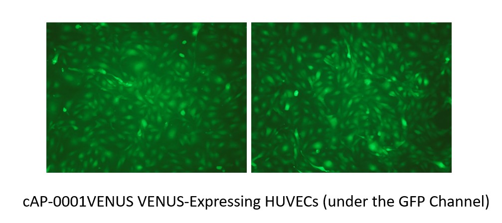 | HUVECs (cAP-0001) were infected with VENUS- expressing Lentiviral particles @ passage 1. BSD resistant VENUS-HUVECs (cAP-0001VENUS) were selected and shipped in frozen vials (cells are provided @ passage 3). Endothelial Growth Medium (cAP-02) is recommended for cell culture and these cells have a minimum of 18 population doubling levels when cultured following the protocols described below). |