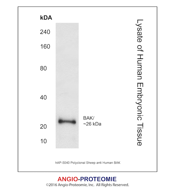 Preparation This antibody was produced from a sheep immunized with purified human BAK protein.