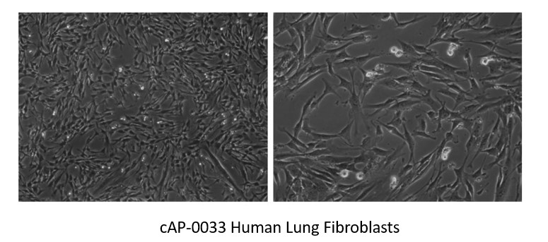 | HLFCs-Ad are isolated from healthy human lung tissue (adult) samples and shipped in frozen vials (the cells are provided @ passage 1). Fibroblast Growth Medium (FGM) (cAP-44) is recommended for cell culture and these cells have an average minimum population doubling levels > at least 14 when cultured following the detailed protocol described below). HLFCs-Ad are tested negative for HIV-1, HBV, HCV, and mycoplasma. |