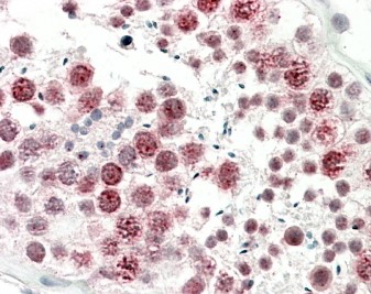 Immunohistochemistry In paraffin embedded Human Testis shows nuclear staining primarily in spermatogonia and in cellular membrane. Recommended concentration, 5-10µg/ml.