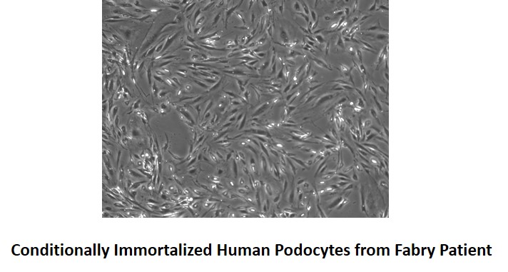 | Fabary Patient glomerular Podocytes were initially collected from the urine. Conditionally immortalized Fabry Patient Glomerular Podocytes (CI-HGlPod Cells-F) are selected by puromycin after primary Fabry patient podocytes are infected with the lentiviral particles expressing SV40 under the control of CMV promoter with the Ten-on system. Podocyte Growth Medium (cAP-47) is recommended for cell culture and these cells have an average minimum population doubling levels > 50, when cultured following the detailed protocol described below). |