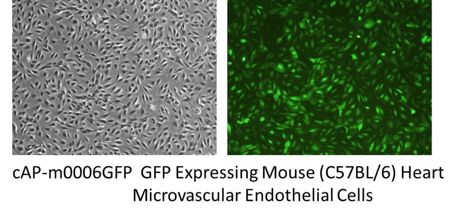 | Mouse Heart Microvascular Endothelial Cells (mHtMVECs) were isolated from hearts of 4-week old C57/Black6 mice and SV40-GFP-mHtMVECs were selected from mHtMVECs infected with SV40 and GFP expressing lentiviruses with puromycin. Endothelial Growth Medium (cAP-02) is recommended for the expansion of SV40-GFP-mHtMVECs. And we warranty a minimum of 30 passages of the cells if cultured following the detailed protocol described below). |