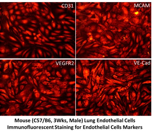 | Mouse Pulmonary Microvascular Endothelial Cells (mPulMVECs) were isolated from lungs of 4-week old C57/Black6 mice and SV40-GFP-mPulMVECs were selected from mPulMVECs infected with SV40 and GFP expressing lentiviruses with puromycin. Mouse Endothelial Growth Medium (Low serum, cAP-69) is recommended for the expansion of SV40-GFP-mHtMVECs. And we warranty a minimum of 10 passages of the cells if cultured following the detailed protocol described below). |