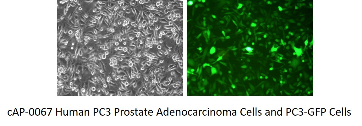 | Human PC3 Prostate Adenocarcinoma Cells were isolated from a male patient with Prostate adenocarcinoma (from metastatis site, bone). GFP-Expressing PC3 cells are selected from PC3 cells infected with GFP expressing lentiviruses by Puromycin. The Universal Growth Medium (UGM, cAP-01B, containing 10%FBS) is recommended for the cell culture. |