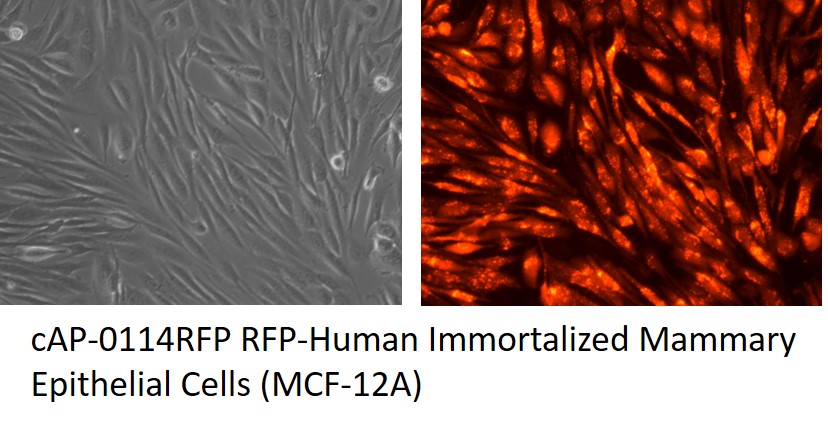 RFP-MCF-12A are selected from the MCF-12A (cAP-0114) after transfected with RFP expressing lentiviruses resistant to Zeocin. Cells are supplied in frozen vials with more than 5 x 10[5] cell/vial. Universal Full Growth Medium (cAP-01B) plus 1 x ITS solution (cAP-26), is recommended to culture the cells. |