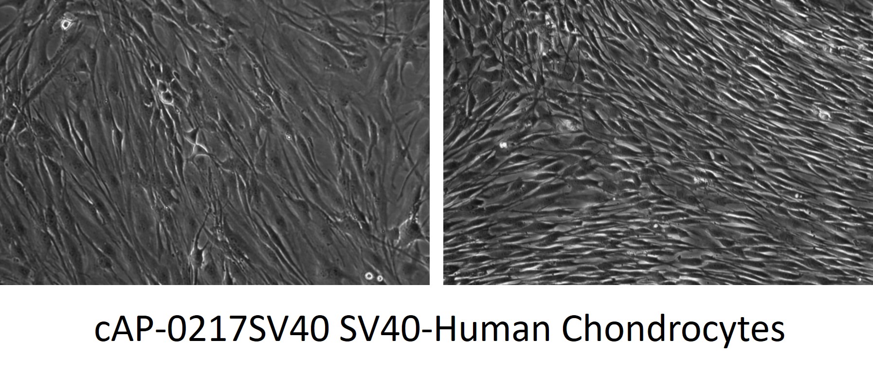 | Human Chondrocytes are derived from normal human articular cartilage. SV40-Human Chondrocytes are selected, with 20ug/ml puromycin, from human Chondrocytes after being infected with lentiviruses expressing SV40 under the control of CMV promoter. The cells are shipped in frozen vials (the cells are provided @ passage 3). Chondrocyte Growth Medium (CGM, cAP-70) is recommended for cell culture and these cells have a minimum average population doubling levels > 40 when cultured following the detailed protocol described below). Human Chondrocytes are negative for HIV-1, HBV, HCV, and mycoplasma |
