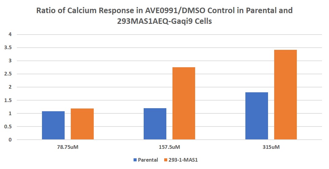 | 3. | Human AVE0991 can induce higher intracellular calcium response (>150uM) in Coelenterazine H preloaded HEK293-MAS1 cells than that in parental Cells. |