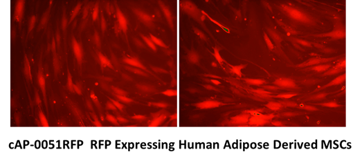 | HAdMSCs (cAP-0051) are isolated from lipoaspirate derived from white adipose tissue and demonstrated with spindle-shaped-, and fibroblast-like cells. RFP-HAdMSCs are puromycin resistant HAdMSCs after trandsfected with lentiviruses expressing RFP under the control of CMV protomer. Each lot of cAP-0051RFP is tested to ensure the cells can be passaged at least three times (i.e., approximately 9 to 10 population doublings) after thaw in complete growth media (Mesenchymal Stem Cell Growth Medium (MSCGM), cAP-35), when cultured following the detailed protocol described below). |