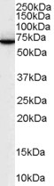 Western Blot Approx 70kDa band observed in Human Lymph Node and Human Peripheral Blood Mononucleocytes lysates (calculated MW of 69.0kDa according to NP_055870.2). Recommended concentration