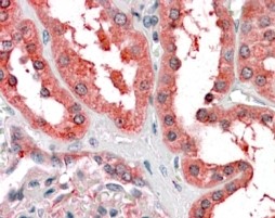 Immunohistochemistry In paraffin embedded Human Kidney shows cytoplasm staining of epithelial cells with some emphasis on the luminal side of the DCT.. Recommended concentration, 3-6µg/ml.