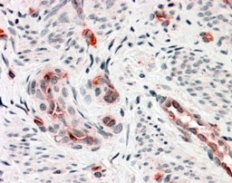 Immunohistochemistry In paraffin embedded Human Uterus shows membranous staining in the endometrial glands. Recommended concentration, 2-6µg/ml.