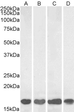 Western Blot Approx 16kDa band observed in Human Brain (Frontal Cortex), Mouse, Rat and Pig Brain lysates (calculated MW of 16.7kDa according to NP_001614.3). Recommended concentration
