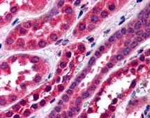 Immunohistochemistry In paraffin embedded Human Kidney shows cytoplasm staining of PCT and DCT cells Recommended concentration, 3-5µg/ml.