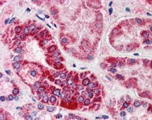 Immunohistochemistry In paraffin embedded Human Kidney shows staining of cytoplasm, stronger in a selection of epithelial cells of distal convoluted tubules. Recommended concentration
